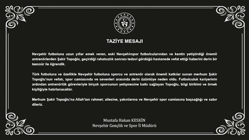 Merhum Şakir Topoğlu’na Allah’tan rahmet; ailesine, yakınlarına ve Nevşehir spor camiasına başsağlığı ve sabır dileriz.