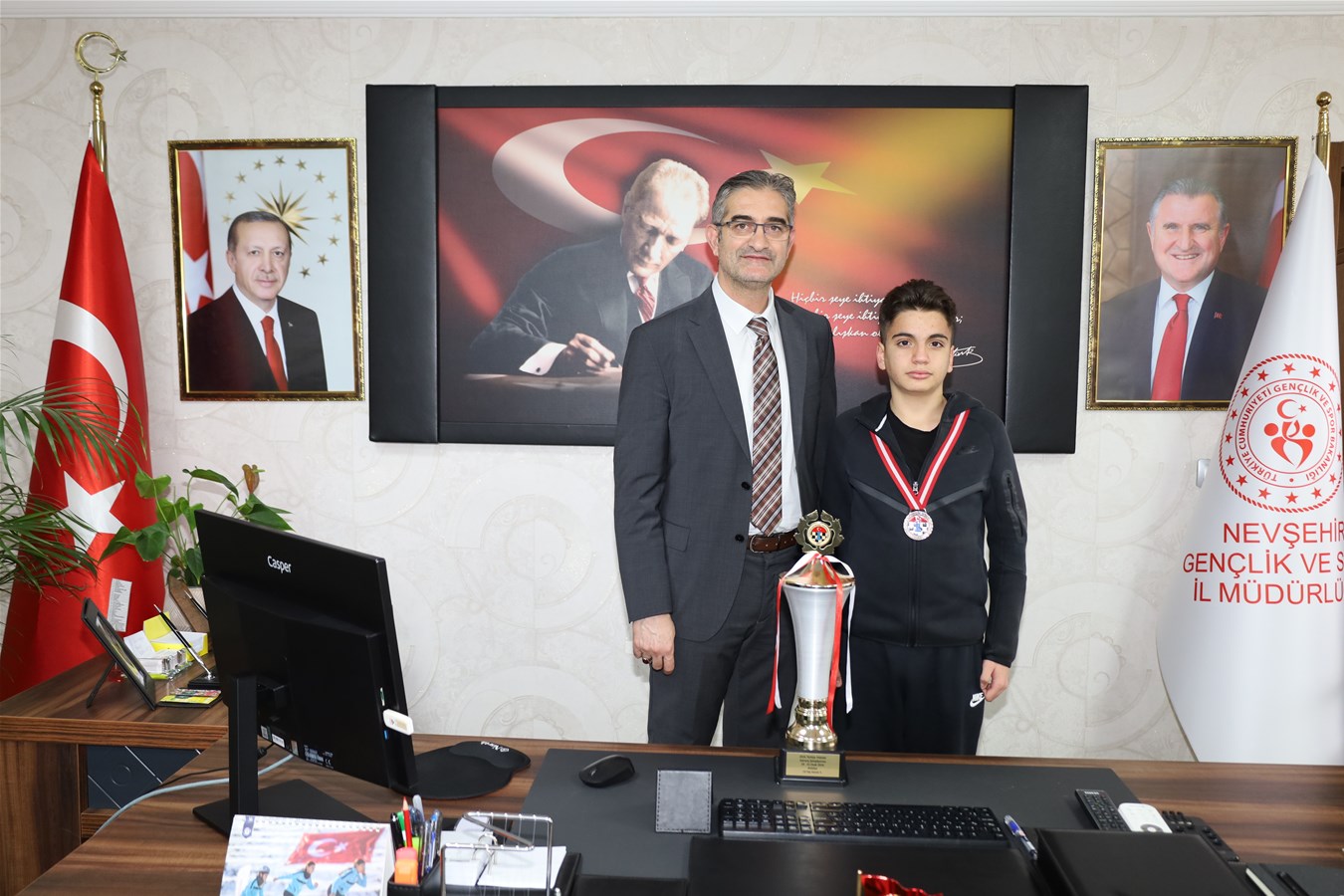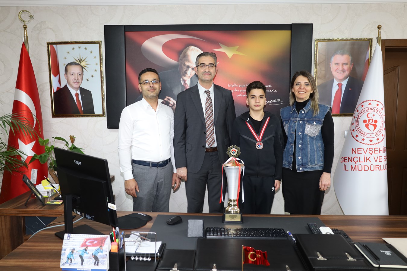 Türkiye Yıldızlar Satranç Şampiyonası’nda 14 yaş genel kategorisinde Türkiye üçüncüsü olarak önemli bir başarı elde eden Çınar İçöz, annesi Sevda İçöz ve Satranç İl Temsilcisi Adnan Kurtul, Nevşehir Gençlik ve Spor İl Müdürü Mustafa Hakan Keskin’i ziyaret etti.